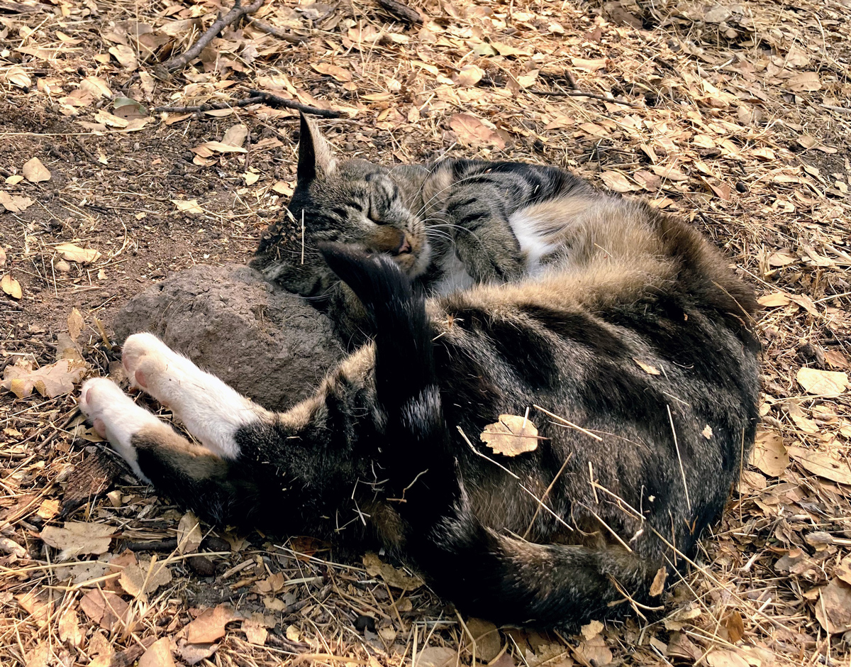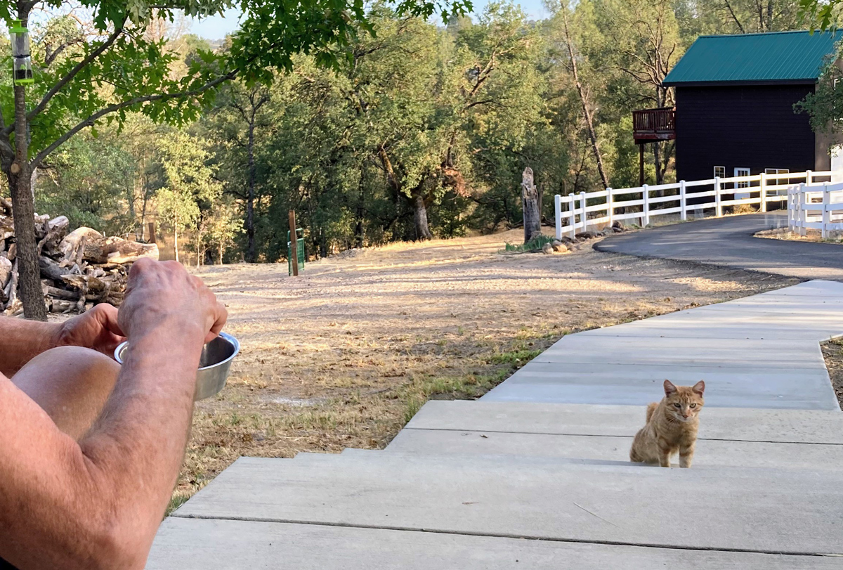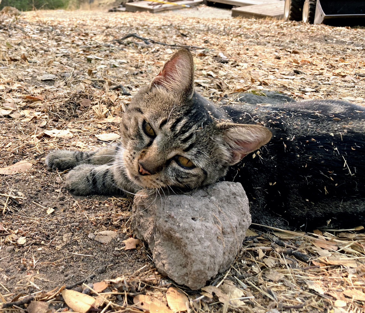 Later in August of 2021, we saw a cat fleeting across one of the fields. He saw us and we all stopped and made eye contact. Turned out to be a young feral cat. After a month of coaxing with food, we were able to get him into a carrier and over to the local vet. Once neutered and vaccinated, he came home to join Rey in her garage apartment. They took it slowly, but after sharing a few catches (mouse/mole/vole/gopher) Rey relaxed. Their bond has grown over the years, and Jules is vigilent to keep Rey safe. If she hasn't come in yet at night, he will keep watch until she does.