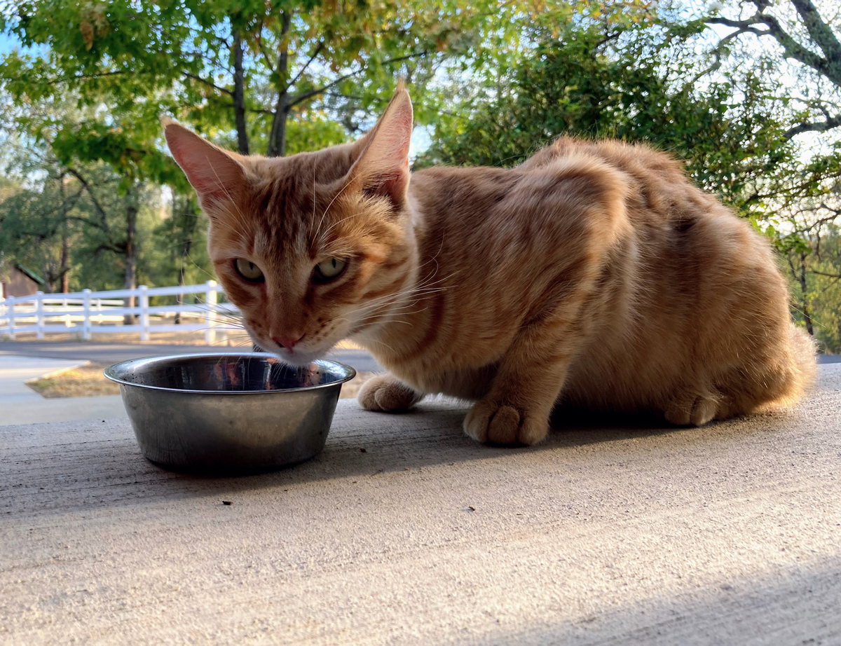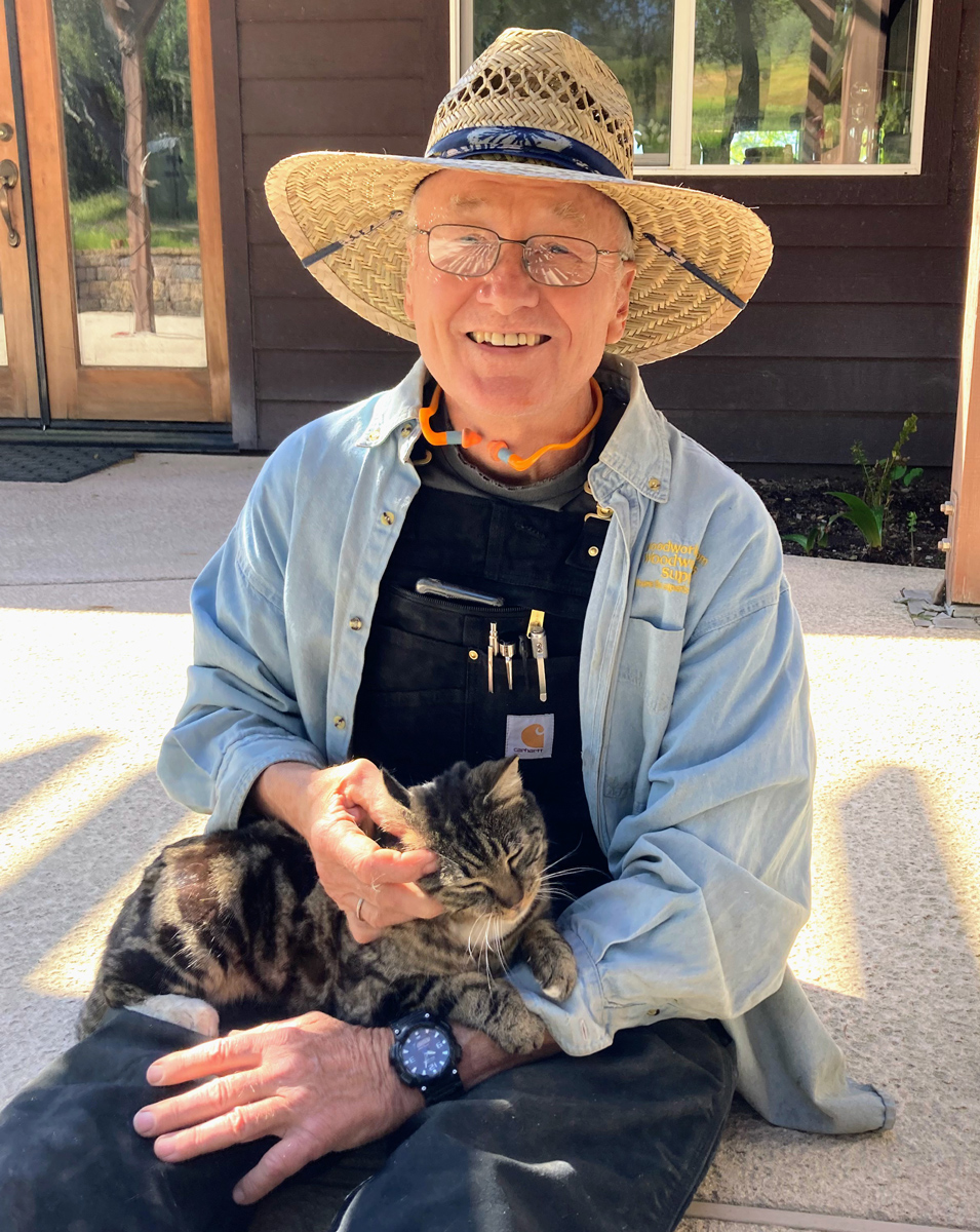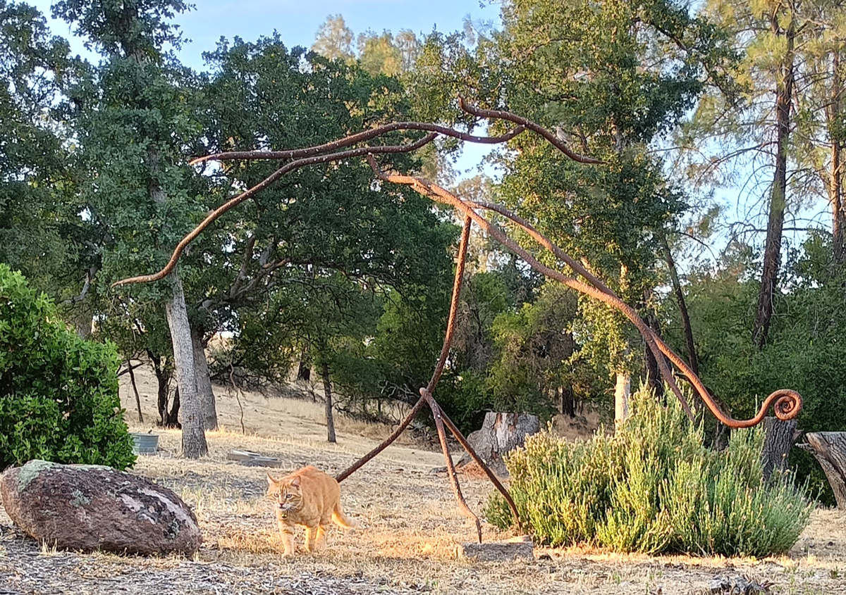Later in August of 2021, we saw a cat fleeting across one of the fields. He saw us and we all stopped and made eye contact. Turned out to be a young feral cat. After a month of coaxing with food, we were able to get him into a carrier and over to the local vet. Once neutered and vaccinated, he came home to join Rey in her garage apartment. They took it slowly, but after sharing a few catches (mouse/mole/vole/gopher) Rey relaxed. Their bond has grown over the years, and Jules is vigilent to keep Rey safe. If she hasn't come in yet at night, he will keep watch until she does.